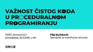 U ponedjeljak 30.03. naš kolega Filip Đuričković održat će gostujuće predavanje na temu “Važnost čistog koda u proceduralnom programiranju”.